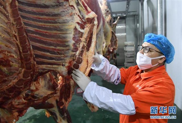 广西河池市都安瑶族自治县在脱贫攻坚产业发展中,建设广西都安西南冷链仓储物流中心,并于2018年6月开始运营。这个中心集屠宰加工、产品展示、电子商务、冷链物流等功能于一体,形成“供、储、展、运、销、配”全产业链条,是都安“贷牛还牛”扶贫产业乃至河池市养殖扶贫产业链的“终点站”,也是从养殖到市场、餐桌的中转枢纽,为当地扶贫产业提供强有力的市场流通保障。 4月23日,在广西都安西南冷链仓储物流中心,一名工人在检查牛肉质量。 新华社记者 陆波岸 摄