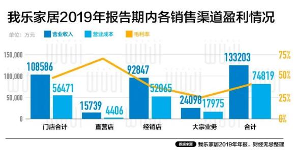 2019年,我乐家居大宗业务上表现强劲,收入提升170.13%达到了2.4亿元,占全年营收结构的22%,高于行业平均水平,显示出较强的渠道优势。
